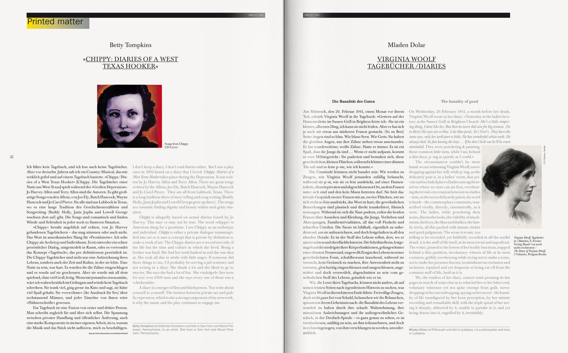 Daniel Baumann on misunderstandings in Sturtevant’s work, and Raimar Stange on logos and spam in Johannes Wohnseifer’s. Inges Gebetsroither writes about the films of French artist Cyprien Gaillard, while Patricia Ellis profiles Peter Doig, the 11.3 million dollar man. A grand tour: documenta 12, Biennale di Venezia and skulptur projekte münster. And of course, Liam Gillick says drop what you’re doing and go read Marx.