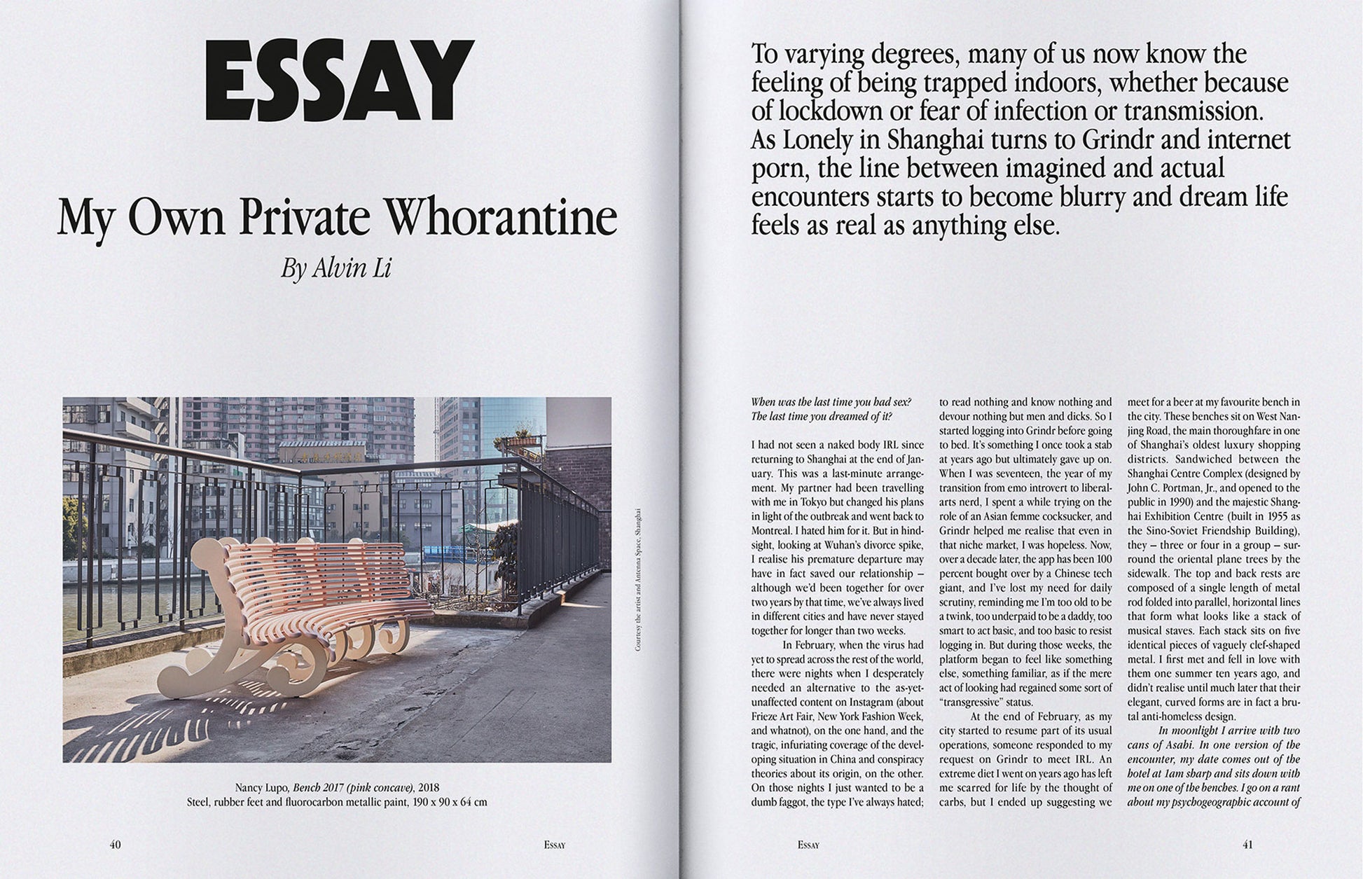 For this early-pandemic issue, we gave our contributors : an open invitation to tell us what’s in their heads right now. Whether under lockdown inside, or outside under protest, it is clear that the mind has no off-switch. Whether deeply personal, or overtly political, our authors continue to surprise with their level of insight and the playfulness of their imagination. Contributions include Shanghai-based writer Alvin Li, who documents his need for intimacy in isolation, French philosopher Catherine Malabou’s answer to the question of pleasure and thinking today, feature profiles on multimedia artist Cao Fei in conversation with curator Hou Hanru, the New York label Women’s History Museum who have been tearing down the decadence of couture for the last six years, and fashion icon Walter Van Beirendonck.