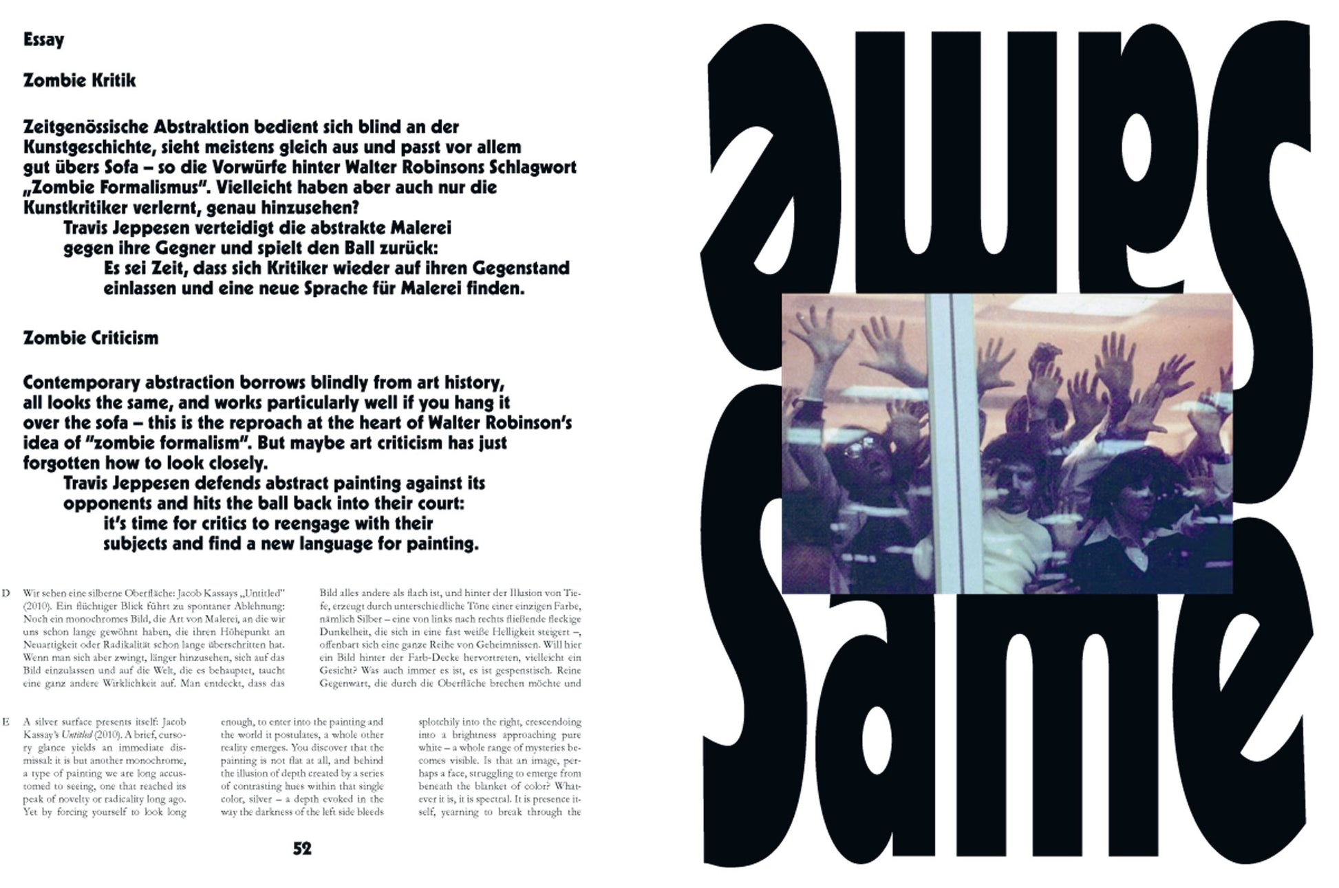 How does the digital, with its rapidly circulating images and high-resolution screens, influence the act of seeing? How is it changing the painted picture? Painting’s code is made and remade over long spans of time, in feedback loops, in dialogue with history. And again and again it stands in the way of progress. You have to dig deep to find out what it means to make pictures today. With Olivier Mosset’s Artist Favourites, a postcard from Giverny sent from artist Clément Rodzielski, Travis Jeppesen on zombie criticism, Bob Nickas on Julia Wachtel, Daniel Bauman on Albert Oehlen, Eva Fabbris on Giorgio Griffa, Rita Vitorelli in conversation with Nicolas Party. Here, the painters give their answers.