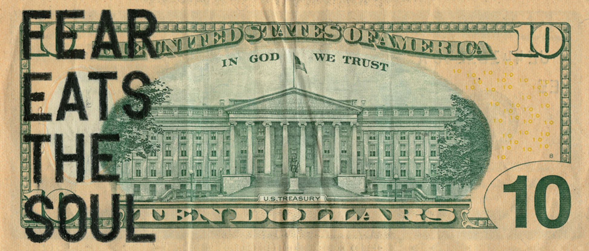 Rirkrit Tiravanija (*1961, Argentina) has repeatedly referenced Fassbinder’s iconic film Fear Eats the Soul in his work since 1994 – on t-shirts, on banknotes, in paintings and, most recently, in the title of an exhibition. In his poster for Spike, Tiravanija continues in the same vein, with a true-to-scale blow-up of a $10 bill bearing the film title, clashing with the truly one-dimensional platitude of the famous American motto »In God We Trust«.