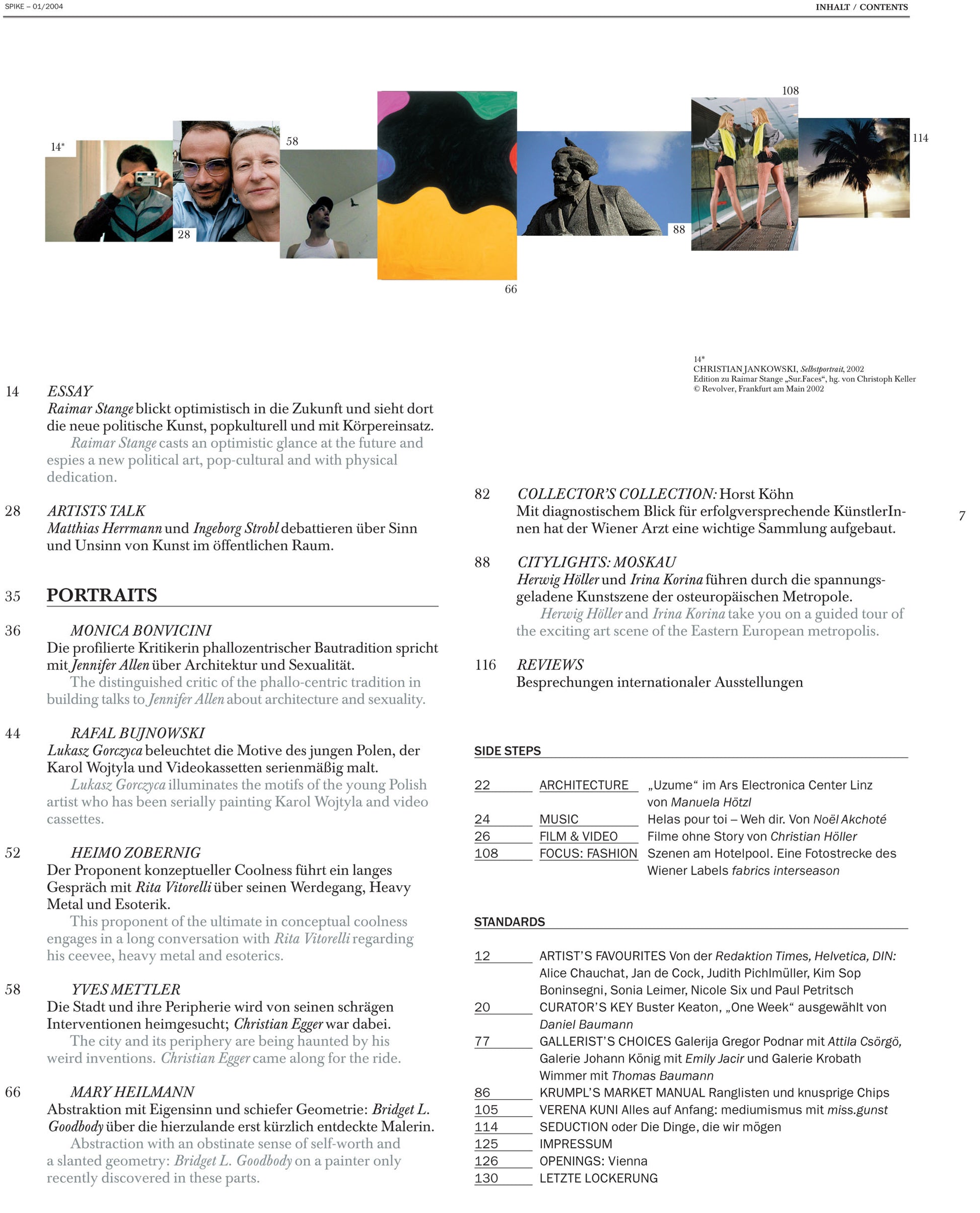Artist Irina Korina takes us on a guided tour of Moscow’s art scene. Rita Vitorelli talks with Heimo Zobernig. Portraits of painter Mary Heilman, sculptor Monica Bonvicini, Yves Mettler and Rafael Bujnowski. Gallerists Johann König and Gregor Podnar present Emily Jacir and Attila Csörgö. Daniel Baumann writes about Buster Keaton’s “One Week”. Noel Akchote visits the Sonar music festival in Barcelona.