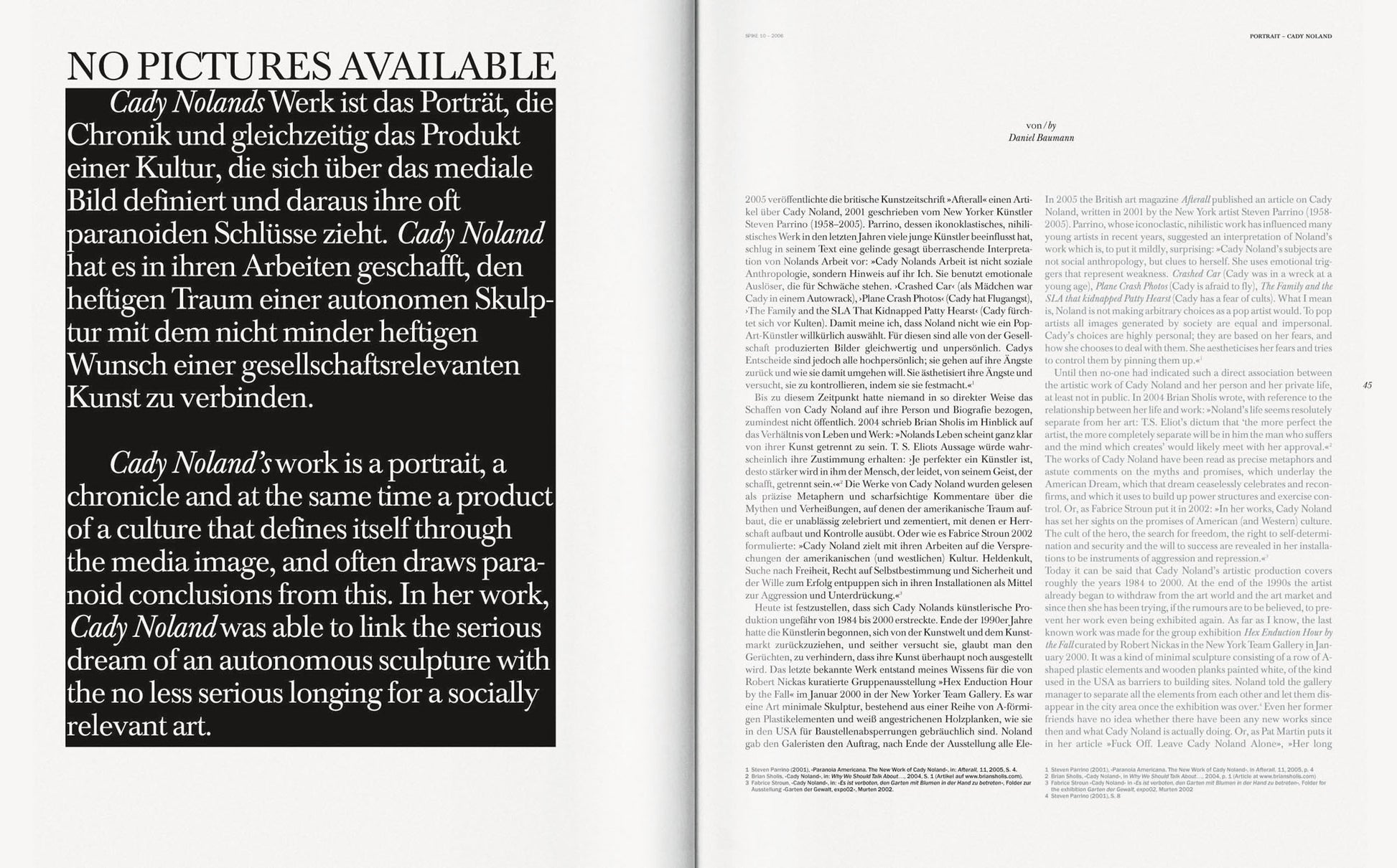 With portraits of Cady Noland, who withdrew from the art world in the late 1990s and continues to fascinate a new generation of artists, Cory Arcangel, Plamen Dejanoff, painter René Daniels, and the Berlin based collector of conceptual art Axel Haubrok. We meet Gerwald Rockenschaub for an interview and report on Belgrade’s crisis of artistic production in the Post-Milosevic era. Curator Chus Martinez discusses a work by David Lamelas, and Kenneth Anger talks about underground film and rock’n’roll.