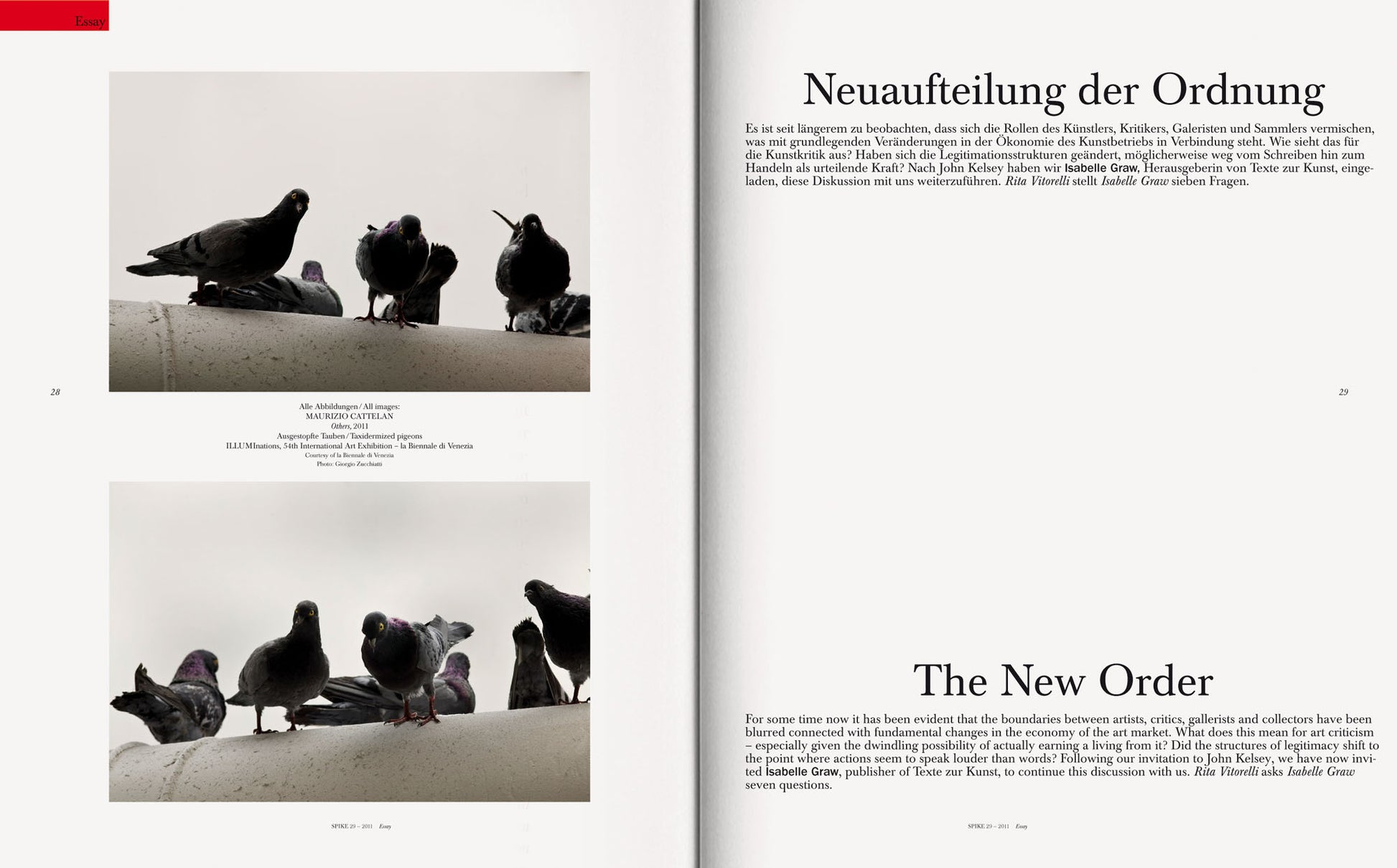 Interviews with Daniel Buren, a pioneer of in situ painting, and British artist Tacita Dean. Portraits of L.A.-based Richard Hawkins and Vienna-based sculptor Lone Haugaard Madsen. Isabelle Graw writes about the art industry’s new order and Sean Landers presents artists who have influenced him. We visit the Venice Biennale, “Time/Food” in New York, and the “Museum of Desires” in Vienna.