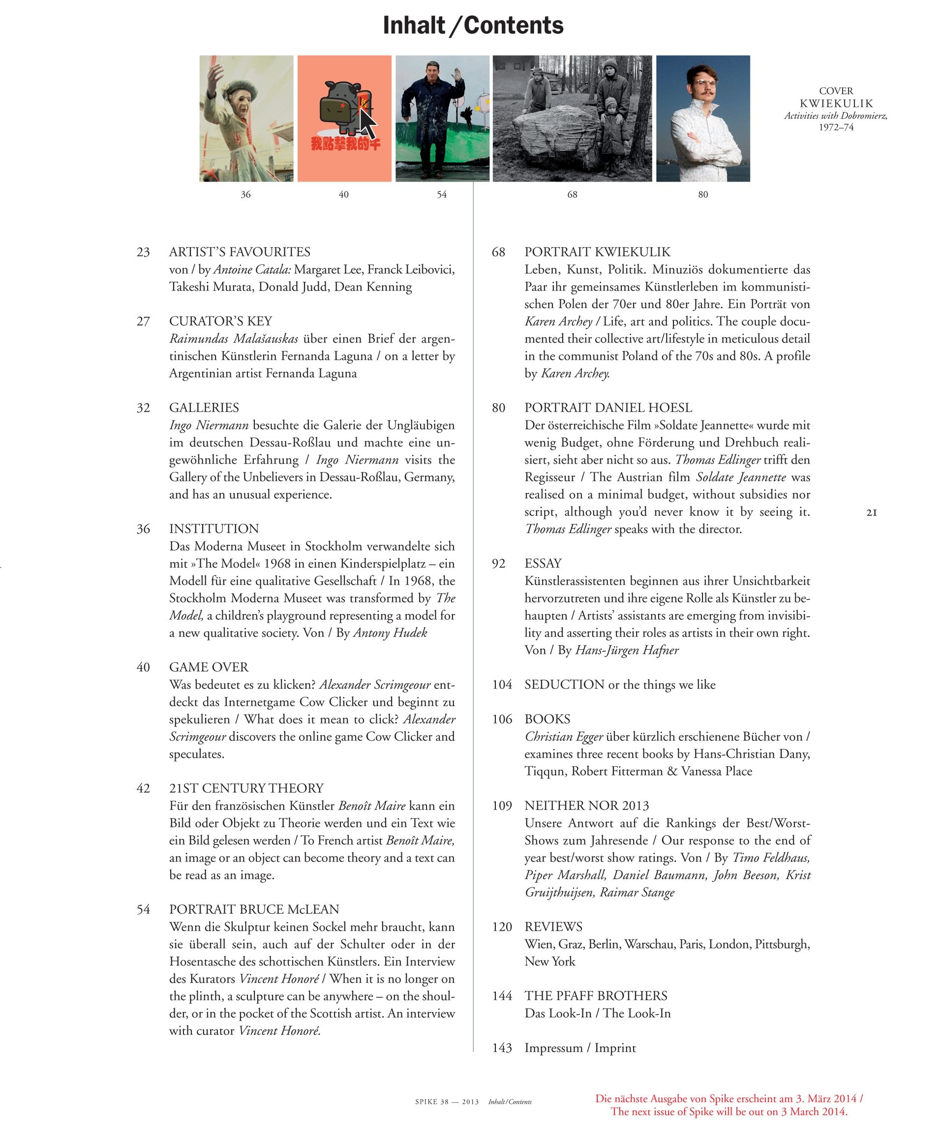 Karen Archey profiles 70s Polish avantgarde artist duo KwieKulik; Vincent Honoré interviews Bruce McLean; and Austrian director Daniel Hoesl talks about his debut feature film Soldate Jeannette. Benoît Maire continues the discussion on the role of objects in contemporary thought; Ingo Niermann stumbles upon the Gallery of the Unbelievers; a speculation on the online game CowClicker by Alexander Scrimgeour; and curator Antony Hudek looks back on Palle Nielsen’s “Model for a Qualitative Society” (1968). Then Timo Feldhaus, Piper Marshall, Krist Gruijthuijsen and others recall shows that left them with an ambivalent verdict.