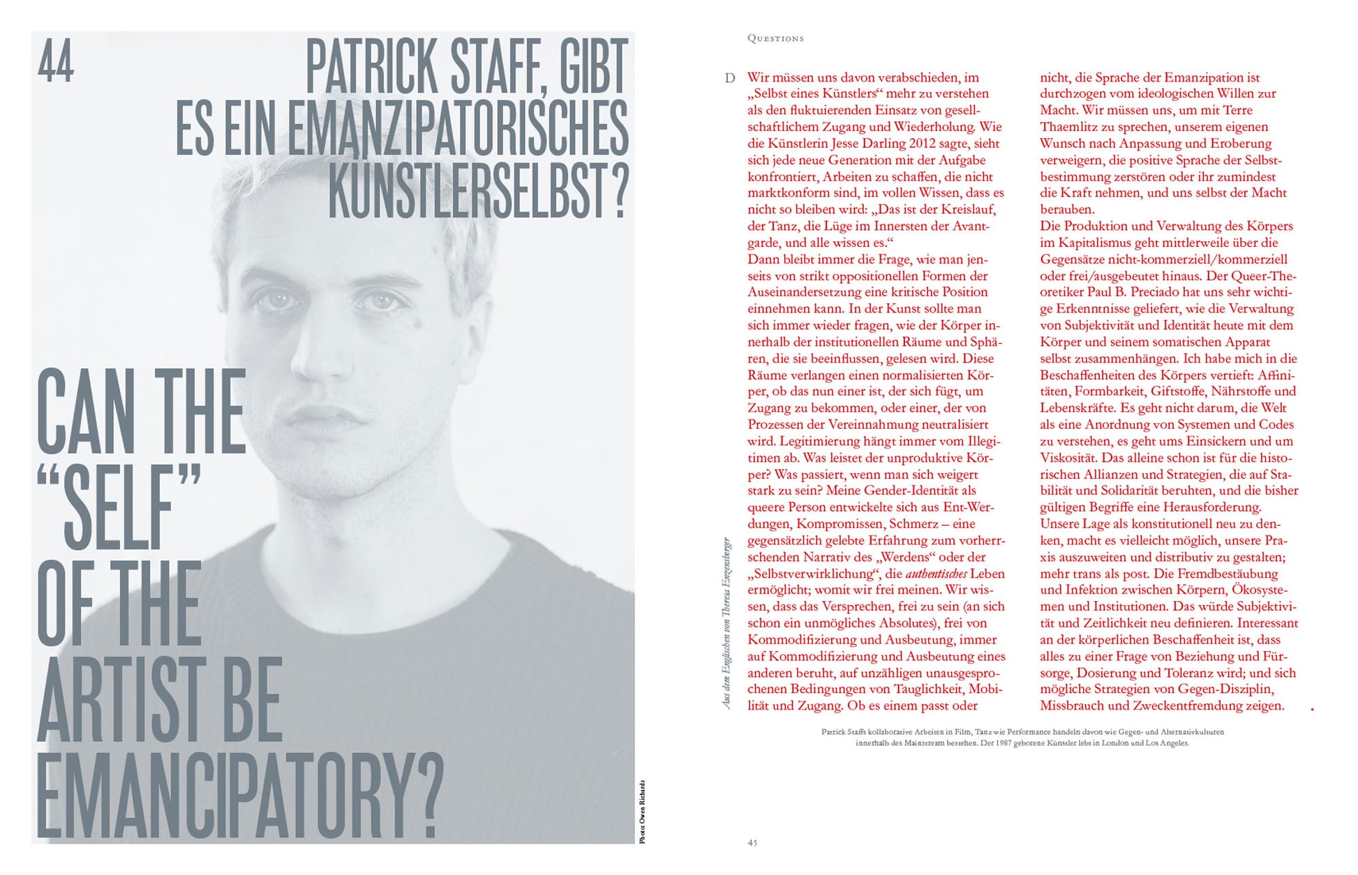 The pressure is rising. Between acceleration and exit, artists and theorists are searching for new forms of resistance. They create their own worlds, enter into collaborations, establish companies, or work to dissolve familiar formats. What does it mean to be political today? What possibilities for action remain, and which ones are opening up? This issue looks for political alternatives and resistance into the art world, and includes discussions between Claire Fontaine’s Fulvia Carnevale, Rory Rowan, Constant Dullaart & Toke Lykkeberg, portraits of Tobias Madison, Barbara Kruger and Omer Fast, an interview with Armen Avanessian, Liam Gillick on the British documentary filmmaker Adam Curtis, and Chus Martínez on the role of art in generating new cultural forms.