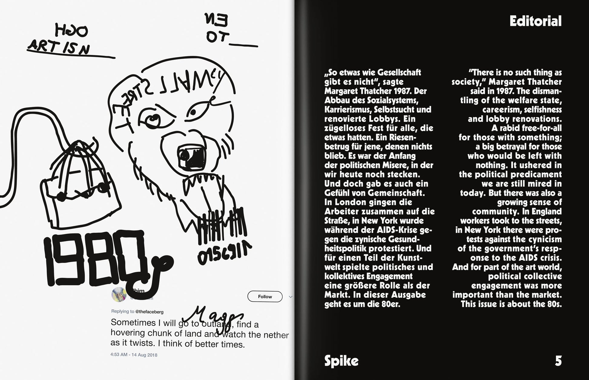 “There is no such thing as society,” Margaret Thatcher said in 1987, ushering in a dismantling of the welfare state, careerism, selfishness and lobby renovations. A rabid free-for-all for those with something; a big betrayal for those who would be left with nothing. But there was also a growing sense of community. In England workers took to the streets, in New York there were protests against the cynicism of the government’s response to the AIDS crisis. And for part of the art world, political collective engagement was more important than the market. With Dean Kissick on i-D, Natasha Stagg on 80s style, gallerist Helene Winer on the New York art scene, a conversation with Gran Fury, and Fiona Duncan on Pippa Garner, our writers bring us a universe with no fixed beginning and more ends for ever night.