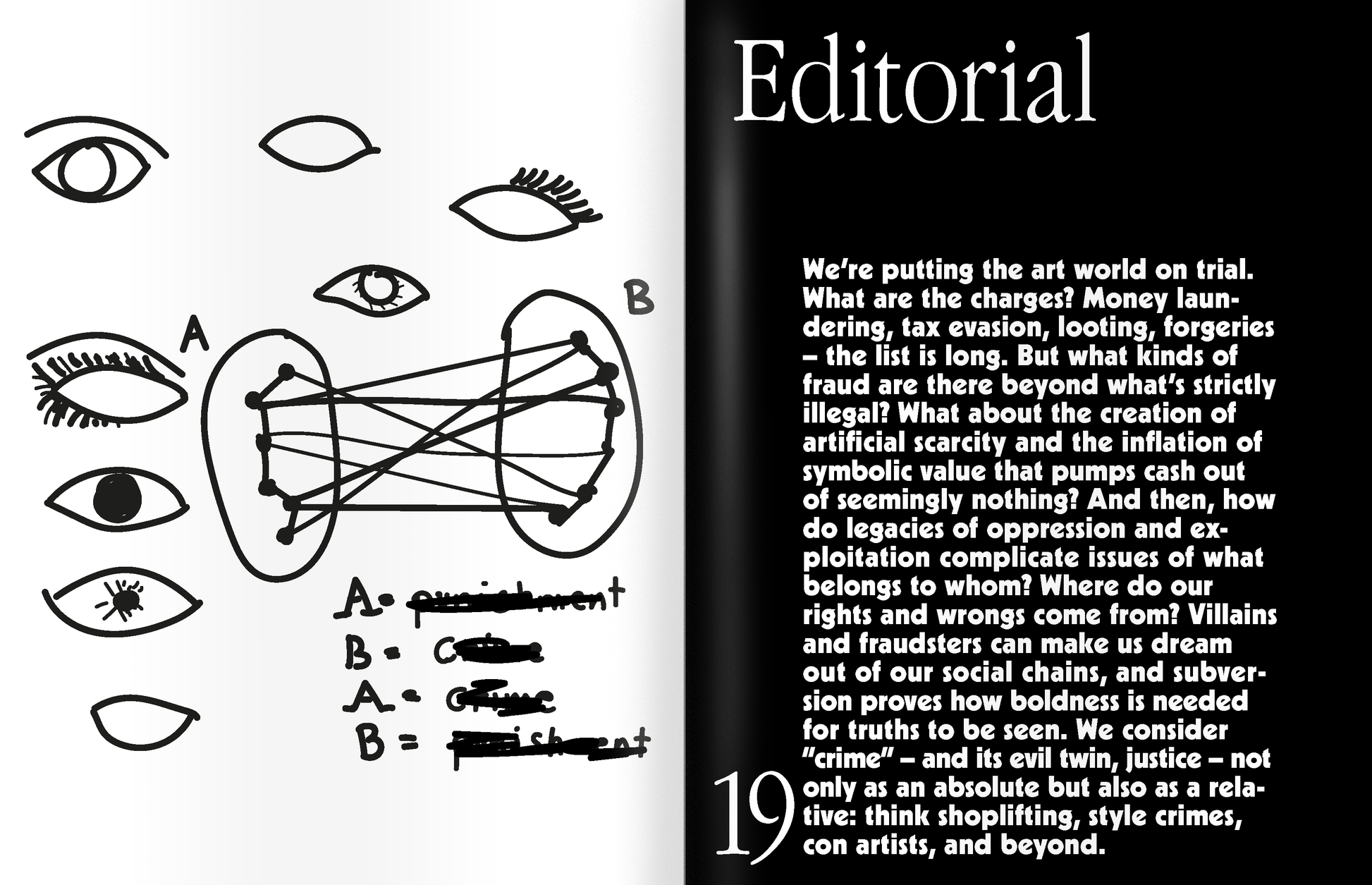 In Spike #72, we put the art world’s money launderers, tax evaders, forgers, and brutes on trial. But we don’t stop there. Our inquisitiveness leads us to bigger questions, like: Is “crime” only defined by its evil twin “justice?” Are our rights and wrongs only norms to be probed? How do we rewrite past injustices? But then, isn’t rupture needed for change? Is acting outside the law the only way to dream of a better world?