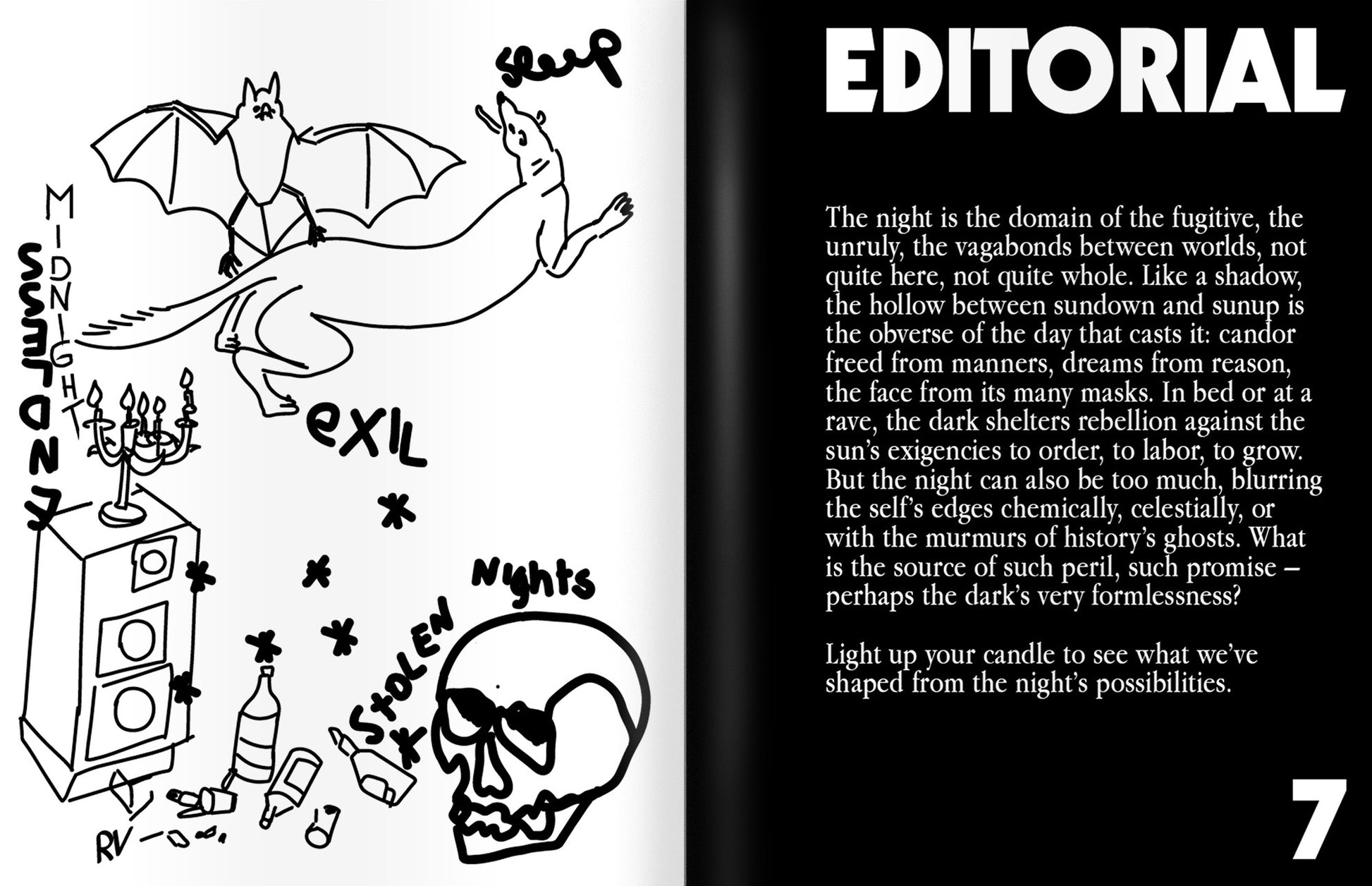 Need a break from the tyranny of the sun? Then light a candle, a headlamp, a flare – anything but your phone – and grap your copy to follow us into the possibility of the night.