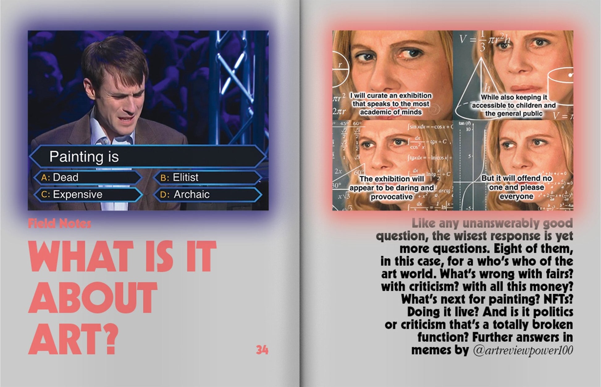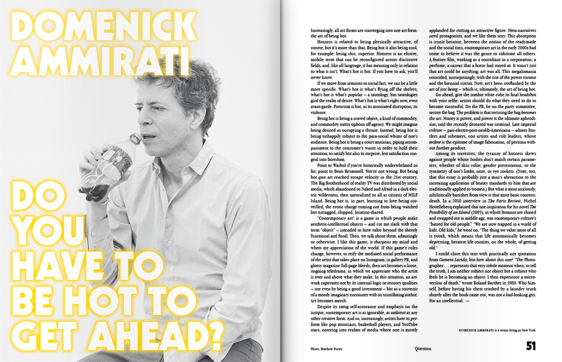With Travis Diehl on riskless art; Domenick Ammirati on getting ahead by getting hot; Anna Kornbluh on culture as pure vibe; Daniel Baumann on the impossibility of succeeding as a curator; an interview with painter and gallerist Jamian Juliano-Villani; Aodhan Madden on the trash girl art of Maggie Lee, Ser Serpas & K8 Hardy; Jaakko Pallasvuo and Kristian Vistrup Madsen talk trying (and failing) to drop out of the art world; a guide to decentralized social media; Marina Abramović’s secret to longevity; a postcard from Riyadh; Nicolas Bourriaud on this year’s Venice Biennale; and so much more.