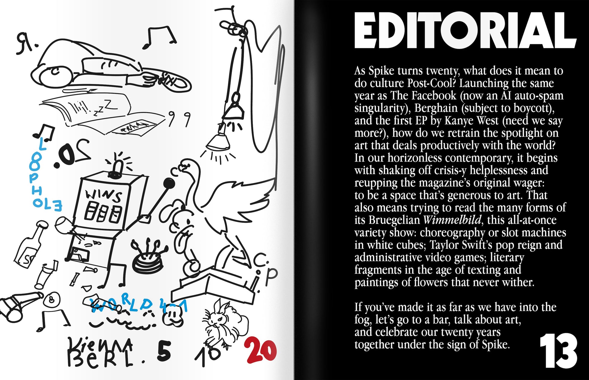 Spike is celebrating 20 years of bringing this same generosity to art with a special double issue. Cultural protagonists in Berlin, Vienna, and New York piece together momentous changes in Spike’s home cities, while founding publisher Rita Vitorelli narrates running the mag as an artist to Dean Kissick, underscored by reprints of seminal essays by the likes of Chris Kraus and Bruce Hainley. Further highlights are Taylor Swift as a millennial paracetamol; Silicon Valley optimizing the body for forever; video games as escapeways back into reality; and white-cube presentations of handicrafts, slot machines, and the choreographic turn.