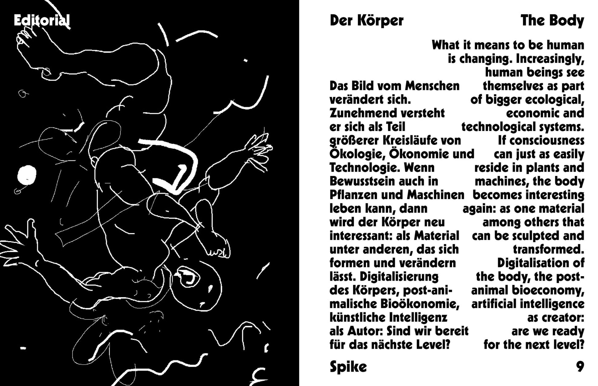 What it means to be human is changing. Increasingly, human beings see themselves as part of bigger ecological, economic, and technological systems. If consciousness can just as easily reside in plants and machines, the body becomes interesting again: as one material among others that can be sculpted and transformed. Digitalisation of the body, the post-animal bioeconomy, artificial intelligence as creator: With Rosi Braidotti, 1992’s “Post Human” group show, Hans Scheirl’s Dandy Dust, a roundtable about the future of eating, portraits of Ian Cheng, Stelarc and Hannah Perry, Bernhard Willhem on the perfect body of the future, Transformers: an essay by Bryan Droitcour, Elisa Ambrogio’s music videos, and Guyotat’s Eden Eden Eden from 1970.