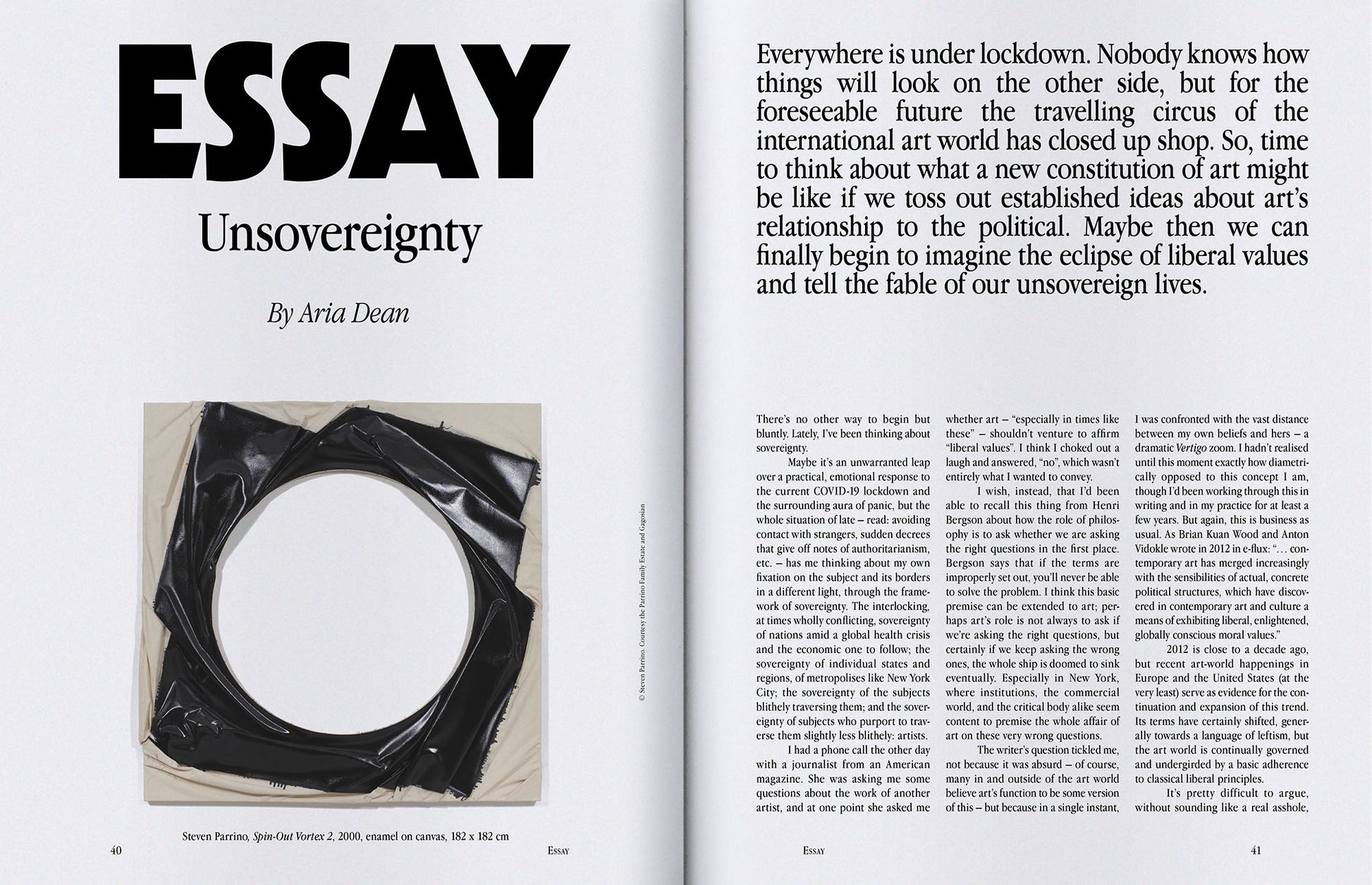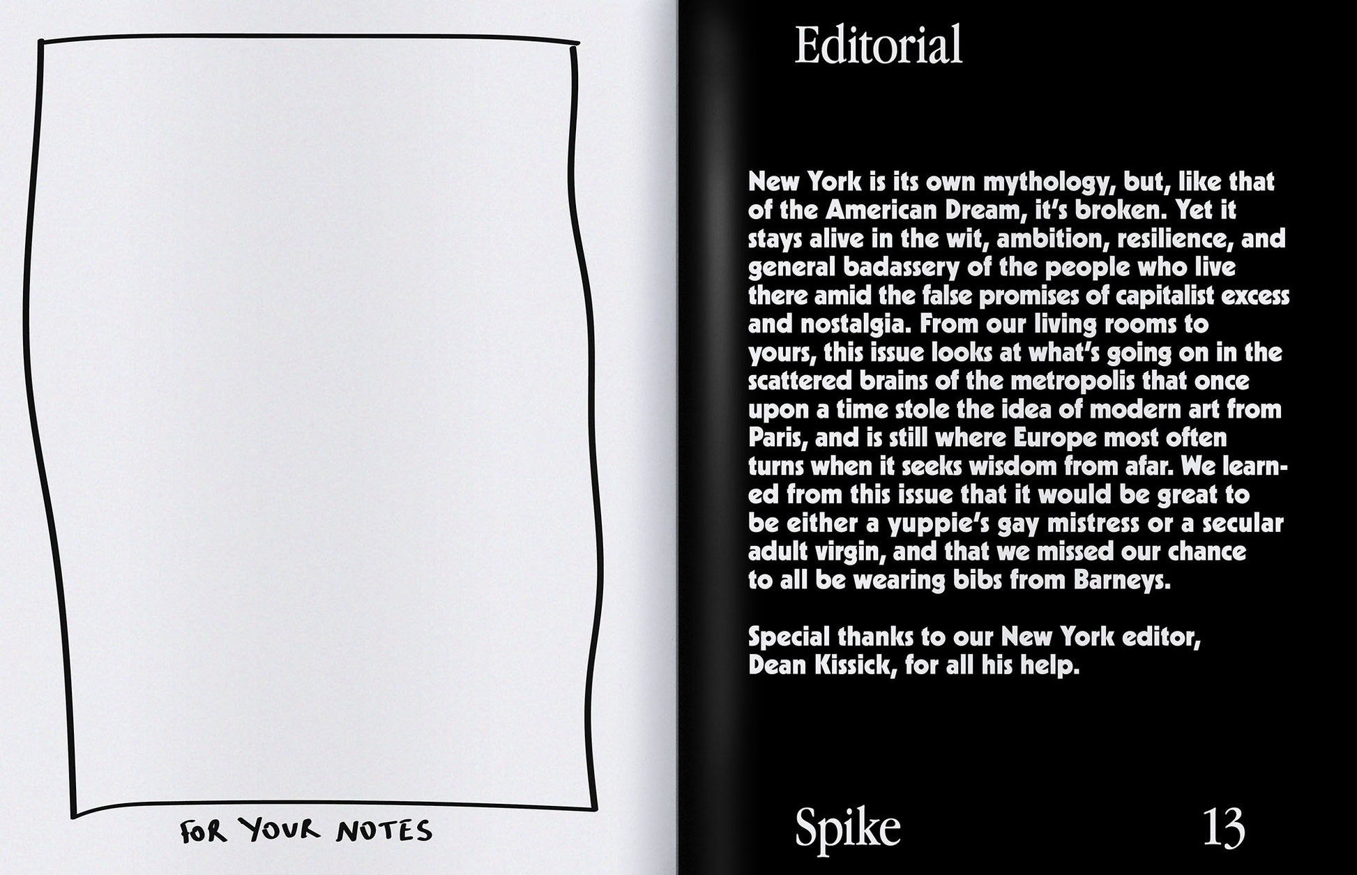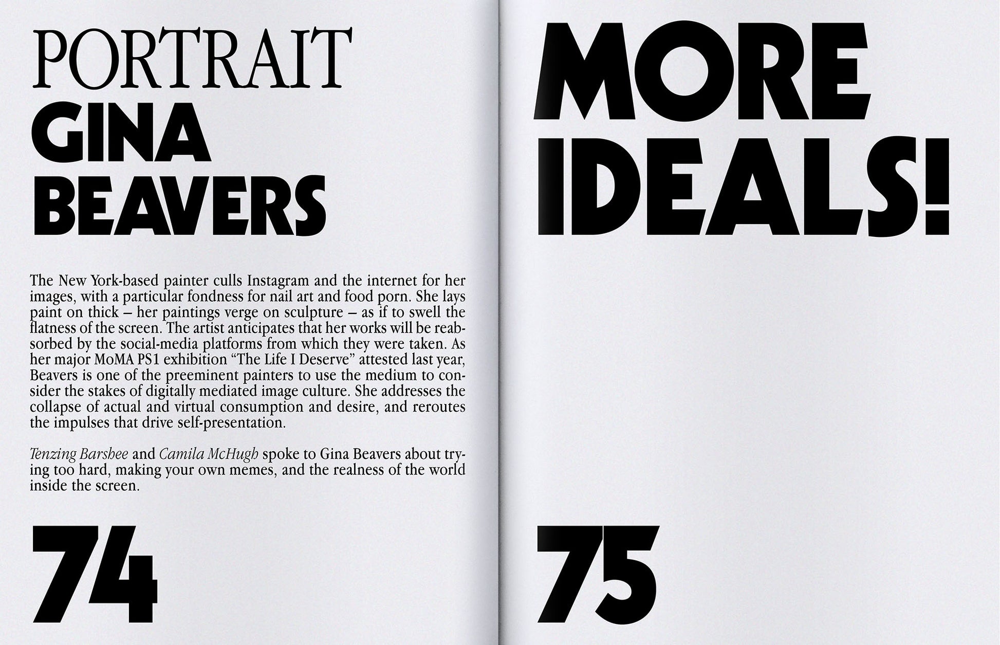 Dedicated to New York, this issue offers a sketch of the city through the scattered minds of those who live, or lived, there. The contributions included chart the highs, and lows, of this metropolis, from Kaitlin Phillips on the lack of virgins in the art scene in the city to Sean Monahan on why New York sucks today. The changing nature of the art world in Chelsea is discussed in an interview with gallerist Carol Greene, and MoMA PS1 curator, Ruba Katrib, reflects on Alex Bag’s semi-autobiographical portrait of an art student in New York. Cory Arcangel’s favourite new things, plus, a portrait of painter Gina Beavers, an essay on unsovereign bodies by Aria Dean, and a trip to New York Fashion Week with Natasha Stagg.