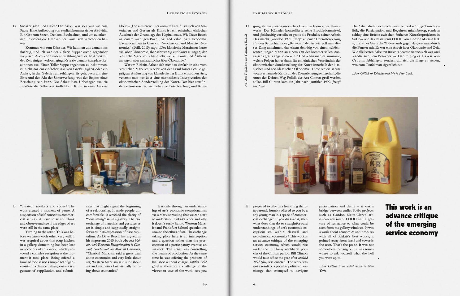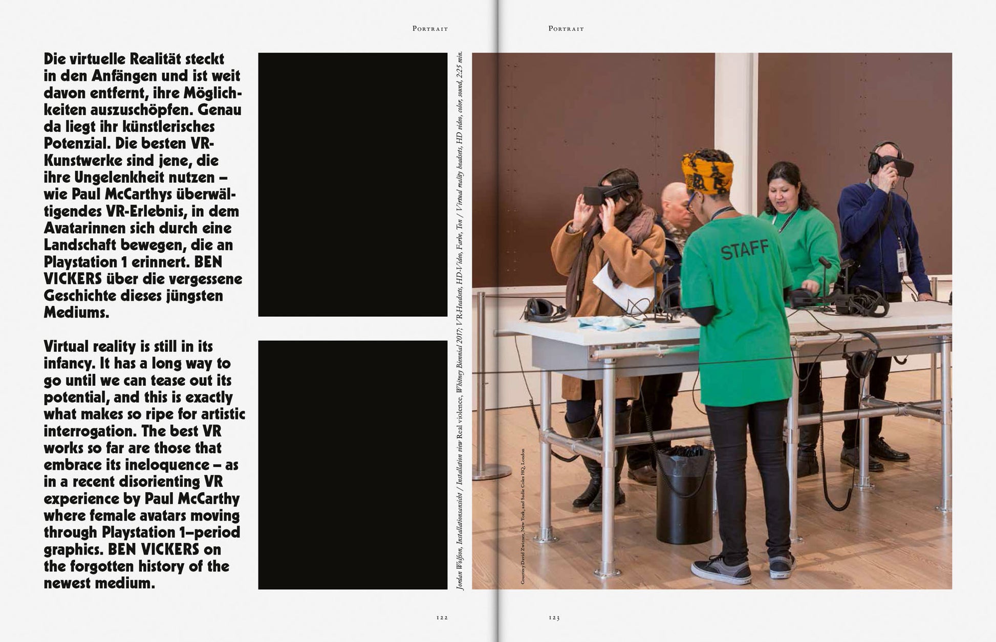 The borders of fiction and reality are slipping ever further. A lot of what is behind the images on our screens remains hidden: their political utility; the algorithms through which they appear; the source of their magic. How does that change the nature of the exhibition? Is it moving from the white cube into virtual realms, into the urban fabric, into domestic spaces? Between networks, theory and the market, where is the power of exhibitions today? Also included: Alessandro Bava on the future of exhibition spaces, a review of Documenta 14 in Athens, Liam Gillick on Rirkrit Tiravanija’s exhibition “untitled (1992) free”, and a Q&A with Benjamin H. Bratton, Adriana Lara, and Rózca Farkas, who take on Instagram, exhibition idealism, and “the feed.” Portraits include Karen Kilimnik and Brigitte Kowanz; an essay on Virtual Reality by Ben Vickers, and Andros Zins-Browne in conversation with Asad Raza.